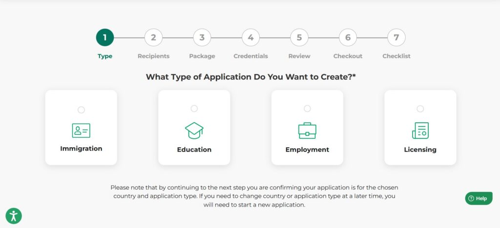 4. Type de demande : À l’écran suivant, lorsqu’il faut indiquer le type de demande, sélectionnez Immigration.