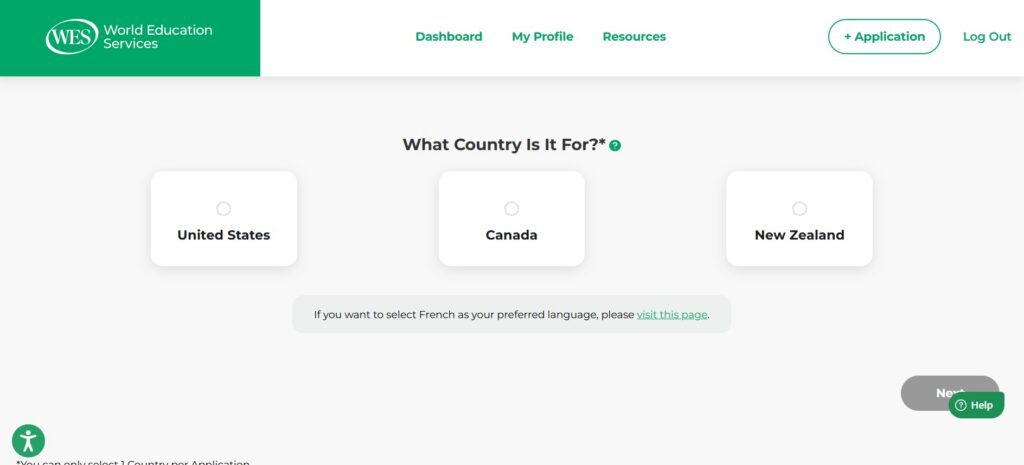 3. Pays : Vous devrez choisir le pays pour lequel vous faites une demande : les États-Unis, le Canada ou la Nouvelle-Zélande. Cliquez sur Canada pour continuer avec un rapport d’EDE pour IRCC.