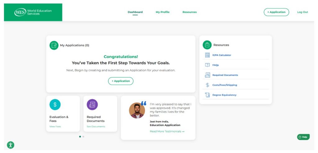 1. Création d’un compte : Tout d’abord, créez un compte auprès de WES. Si vous avez déjà un compte WES, connectez-vous. Une fois la session ouverte, le tableau de bord s’affiche. Il ressemble à ça :