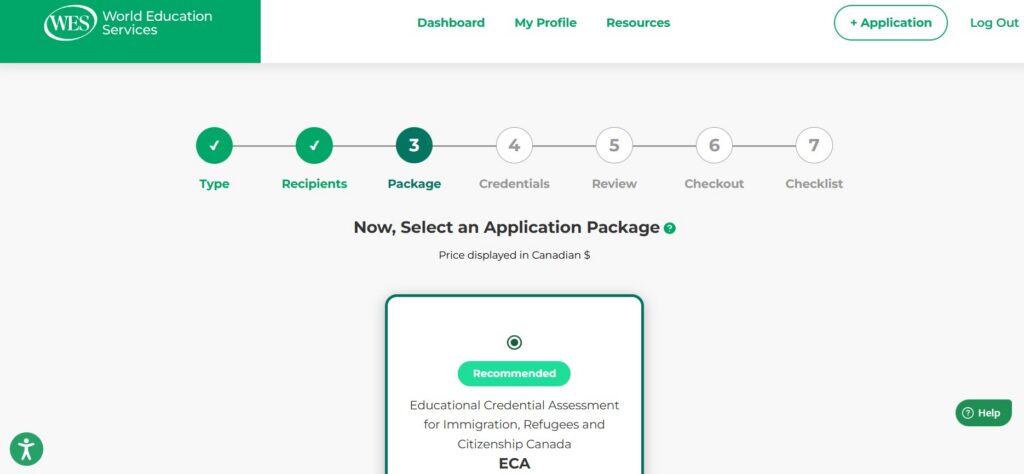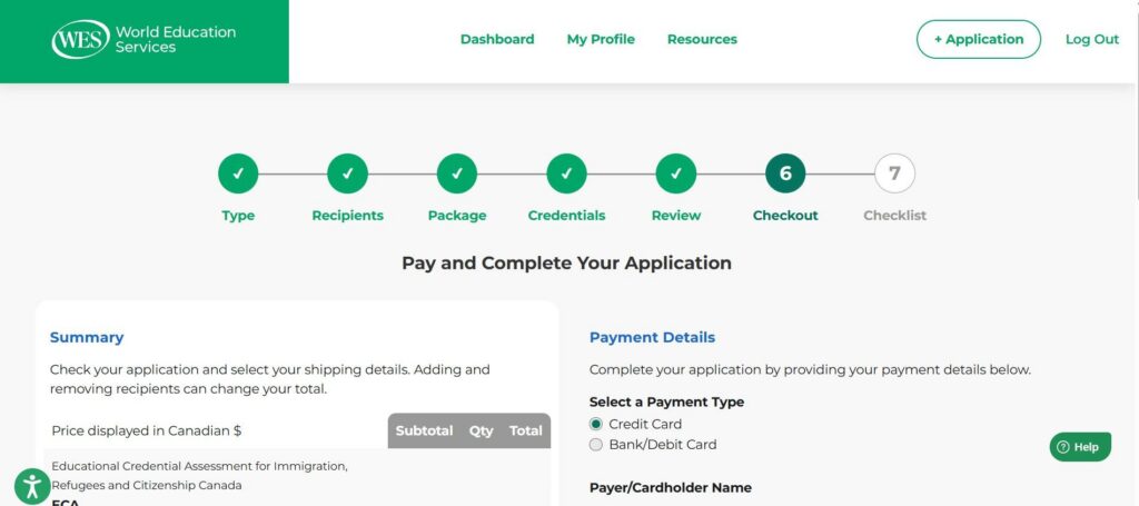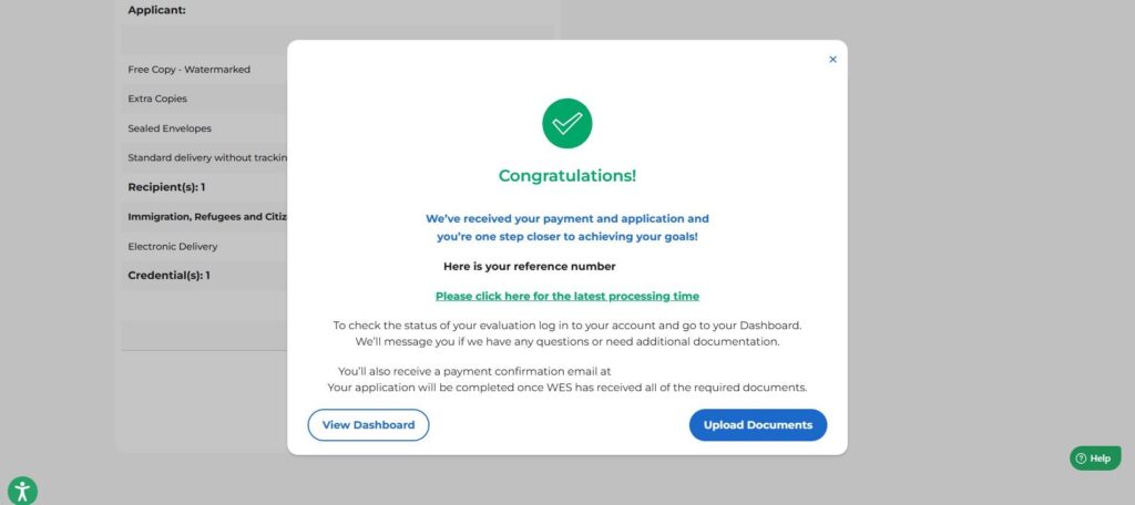10. Enregistrement du numéro de référence WES : Une fois le paiement envoyé, un message de confirmation s’affichera. Vous recevrez votre numéro de référence WES et vous aurez le choix entre consulter le tableau de bord ou téléverser vos documents. Après avoir soumis votre demande, l’étape suivante consiste à fournir les documents requis.